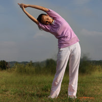 Initially you stand straight. Now separate your legs as much as you can. With your back straight, extend your hands sideward. Inhale and slowly bend towards the right side, with your right hand touching your ankle and your left hand directed upwards. Look at your left hand while you are positioned in this posture. Remain in this posture as long as you can. Remember, not to stretch yourself beyond your limits. The purpose of Yoga is to relieve you from pain, not to give additional pain.
